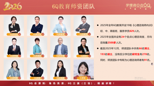 荣誉的核心支撑是人。我们汇聚了一支涵盖66名博士、193名硕士,且受训于十余个主流心理学流派的资深师资队伍。团队的专业性不仅体现在资历上,更体现在通过6Q平台实现的持续成长与价值整合上。许多咨询师在这里不仅深化了专业,也拓宽了事业路径,实现了社会价值与个人发展的统一。