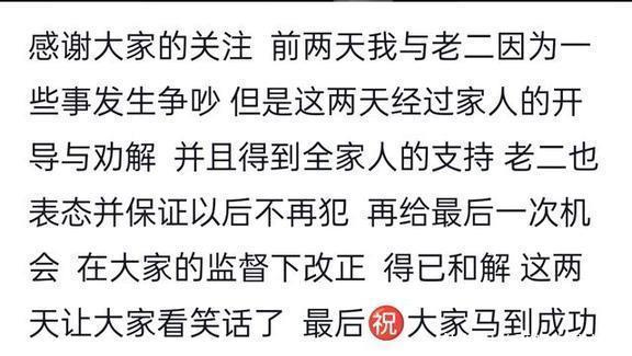 二嫂当时还说,过段时间会跟大伙儿好好说道说道这里面的缘由。就在大伙儿都伸长了脖子等着听下文的时候,二嫂又突然丢出一个视频,告诉大家“俩人已经和好了”。